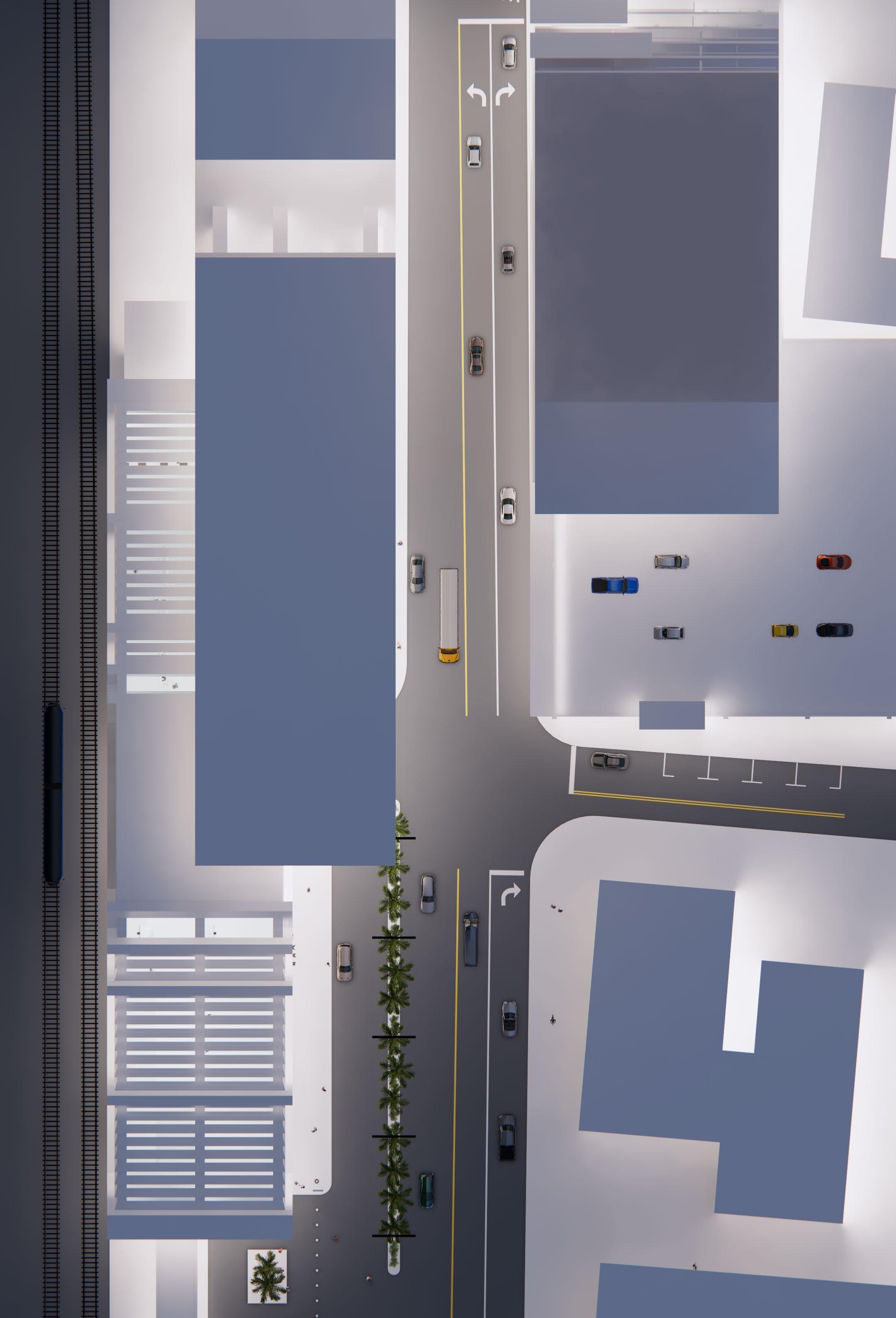 Along with a new train station, a multi-use building is erected across the street, featuring apartments, retailing, and a parking garage for its residences and for customers of the stores.