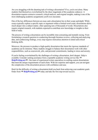 If you're feeling overwhelmed by the challenges of writing a dissertation, don't despair. Help is available. Consider seeking assistance from a reputable academic writing service like ⇒ HelpWriting.net⇔. Our team of experienced writers specializes in crafting custom dissertations that meet the unique requirements of each client. With our expertise and support, you can navigate the complexities of the dissertation process with confidence and ease.