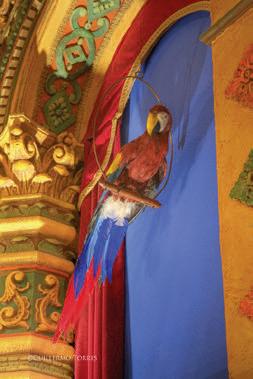 The legend of Loretta the Parrot presides over the Grand Lobby. Back in the day, it was considered good luck to include bird imagery in the design of a theater. For instance, you’ll see aviary designs carved into the mantels and in the Dutch ink drawings above them. It was also good luck to have live birds flying around the theater.