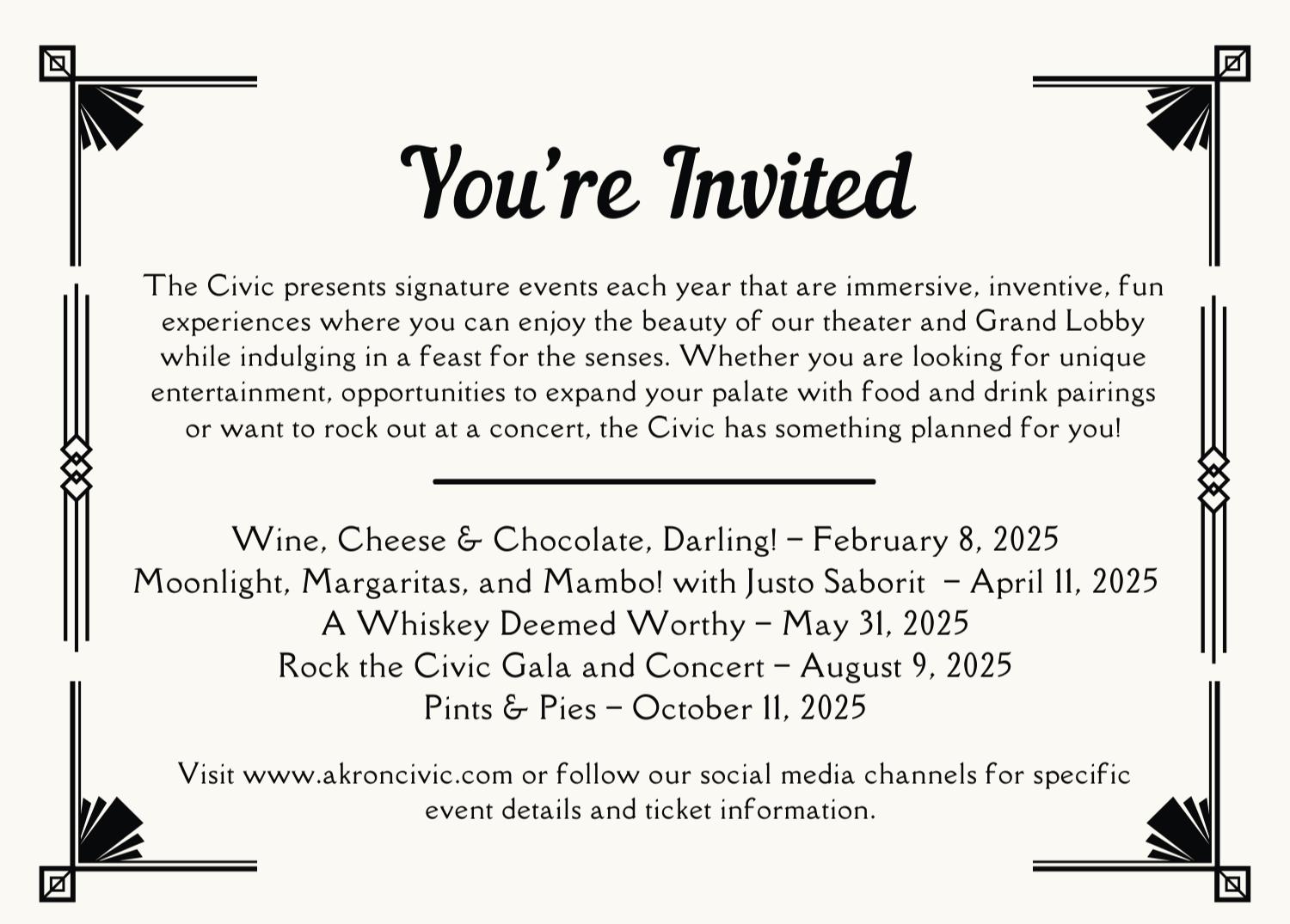 To learn more about opportunities for your business to support the Akron Civic Theatre, The Knight Stage and Wild Oscar’s, contact Colette Taylor, development director, at 330-572-7770 or ctaylor@akroncivic.com
