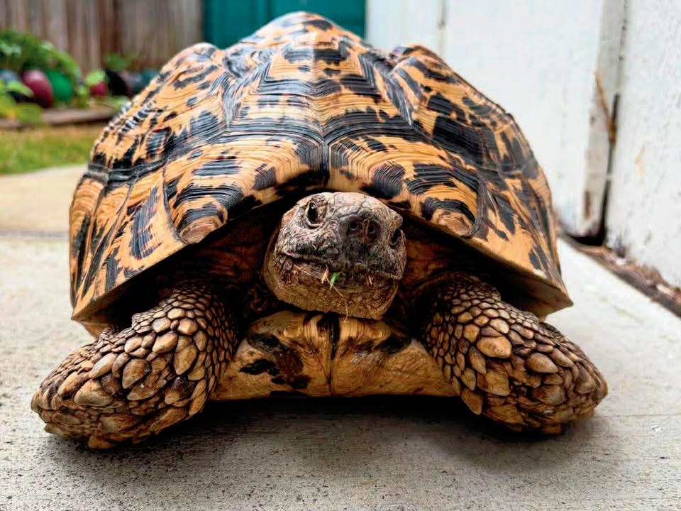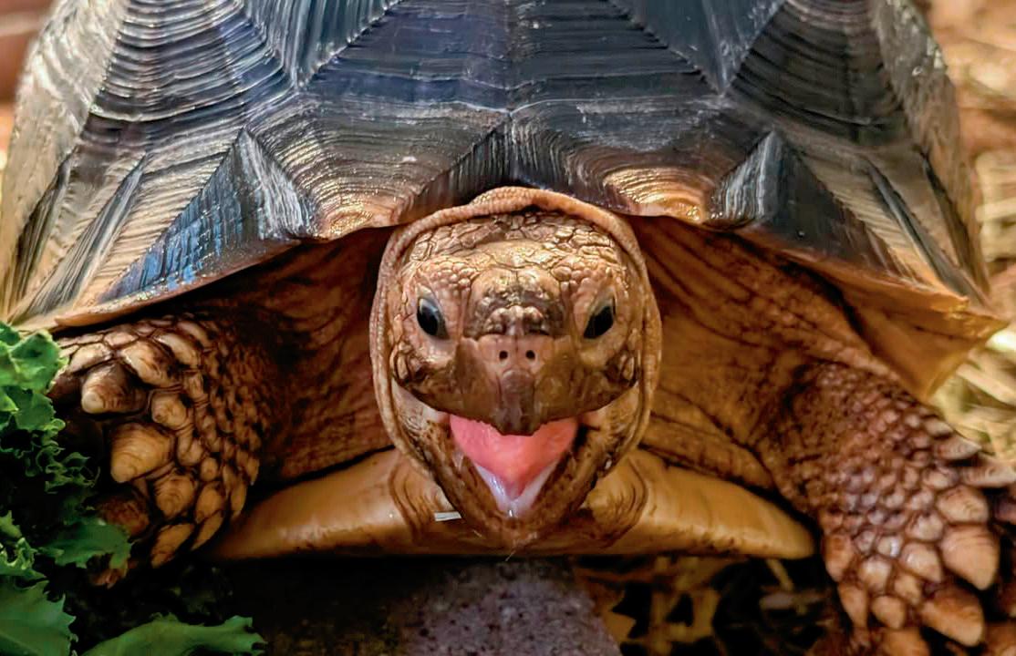 After glancing at aquariums and reptile tanks upstairs in Tom Arbour’s Tallmadge home, the Akron Life team went to his basement, where there are three African fish tanks and an enclosure containing a rare satanic leaf-tailed gecko. I knew he had tortoises, but I was expecting maybe one other tank — until he mentioned this room was just a foretaste of his collection. Then, we entered a spare basement bedroom and walk-in closet converted into a tortoise room. All of the walls are lined with large tortoise enclosures, some stacked on top of one another, and the closet is full of babies he breeds! He has 37 tortoises total and has bred over 100 babies, which he keeps, gives away or sells.
