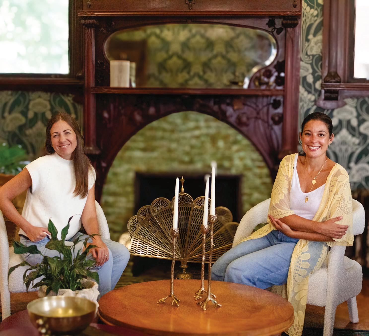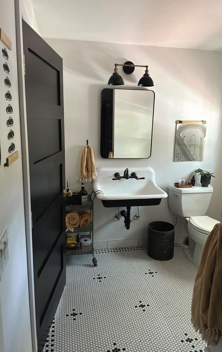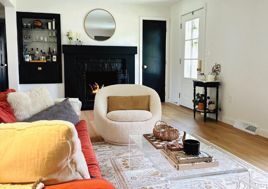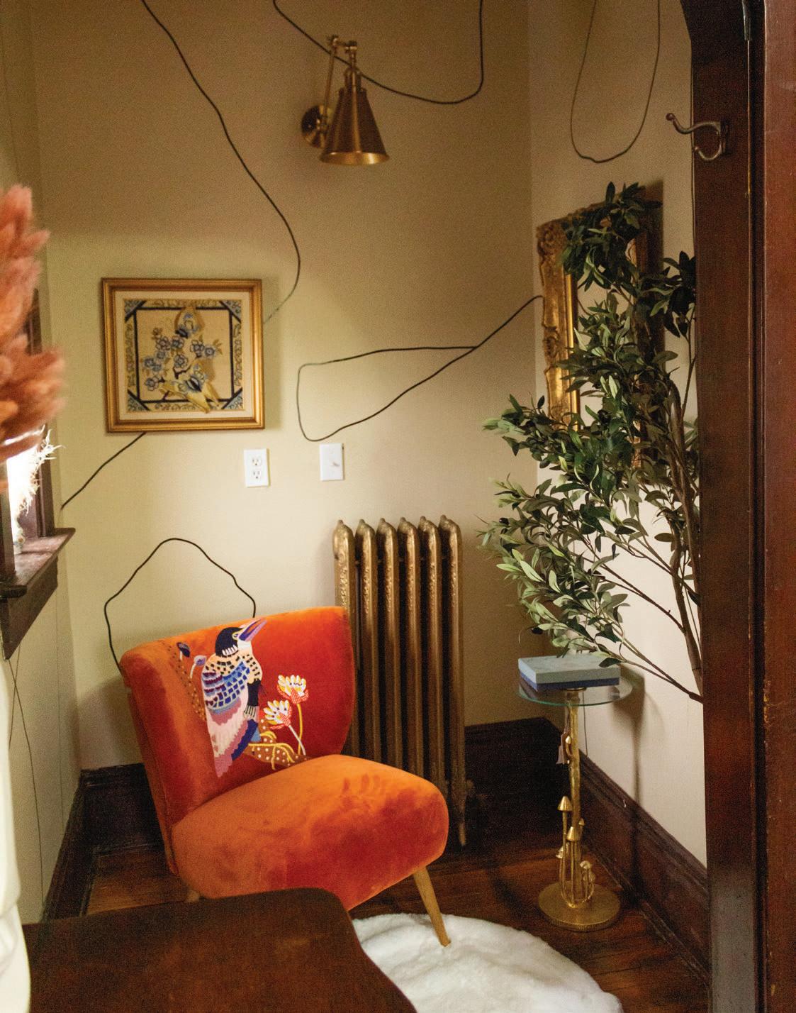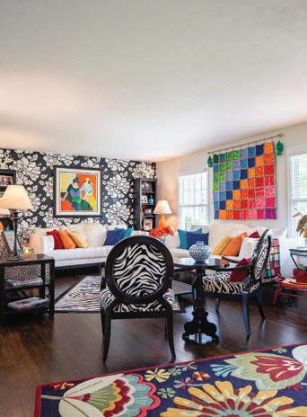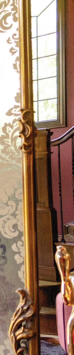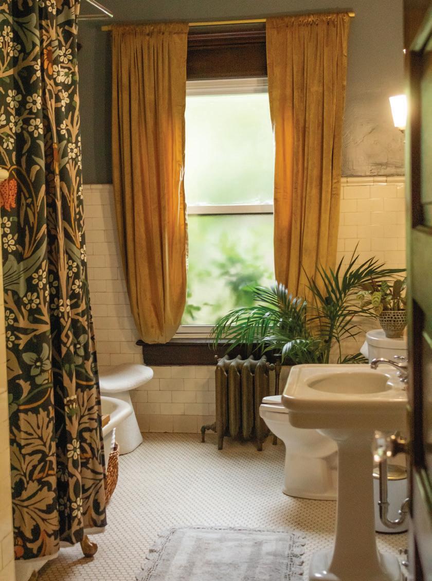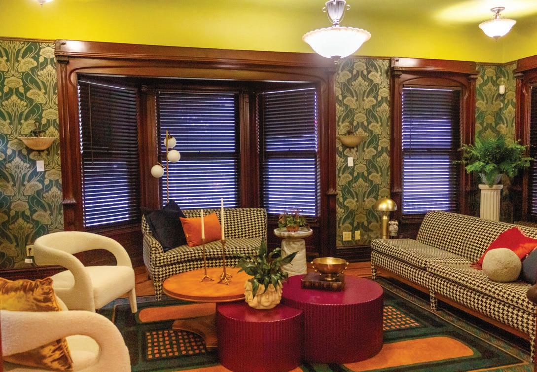 FURNITURE: While art nouveau style can be seen in the wallpaper, woodwork, mirrors and more, the furniture and accessories in the house are more eclectic. Kaser likened their discovery to a scavenger hunt. Trying to find items in West Akron and Northeast Ohio, she searched for antiques from a variety of eras and mixed the older pieces in with furniture bought at local stores. A blackand-white houndstooth sectional came from Facebook Marketplace, while an orange upholstered chair, embroidered with a bird and flowers, came from an Anthropologie outlet in Pittsburgh (as did the fan-patterned wallpaper in one of the bathrooms). Hanging above the chair is a needlepoint portrait of a butterfly that Kaser found at a West Akron garage sale. “I also drew on some Victorian elements,” she says. “I felt like the house was telling me to do that. I try to listen to the whispers of the house.”