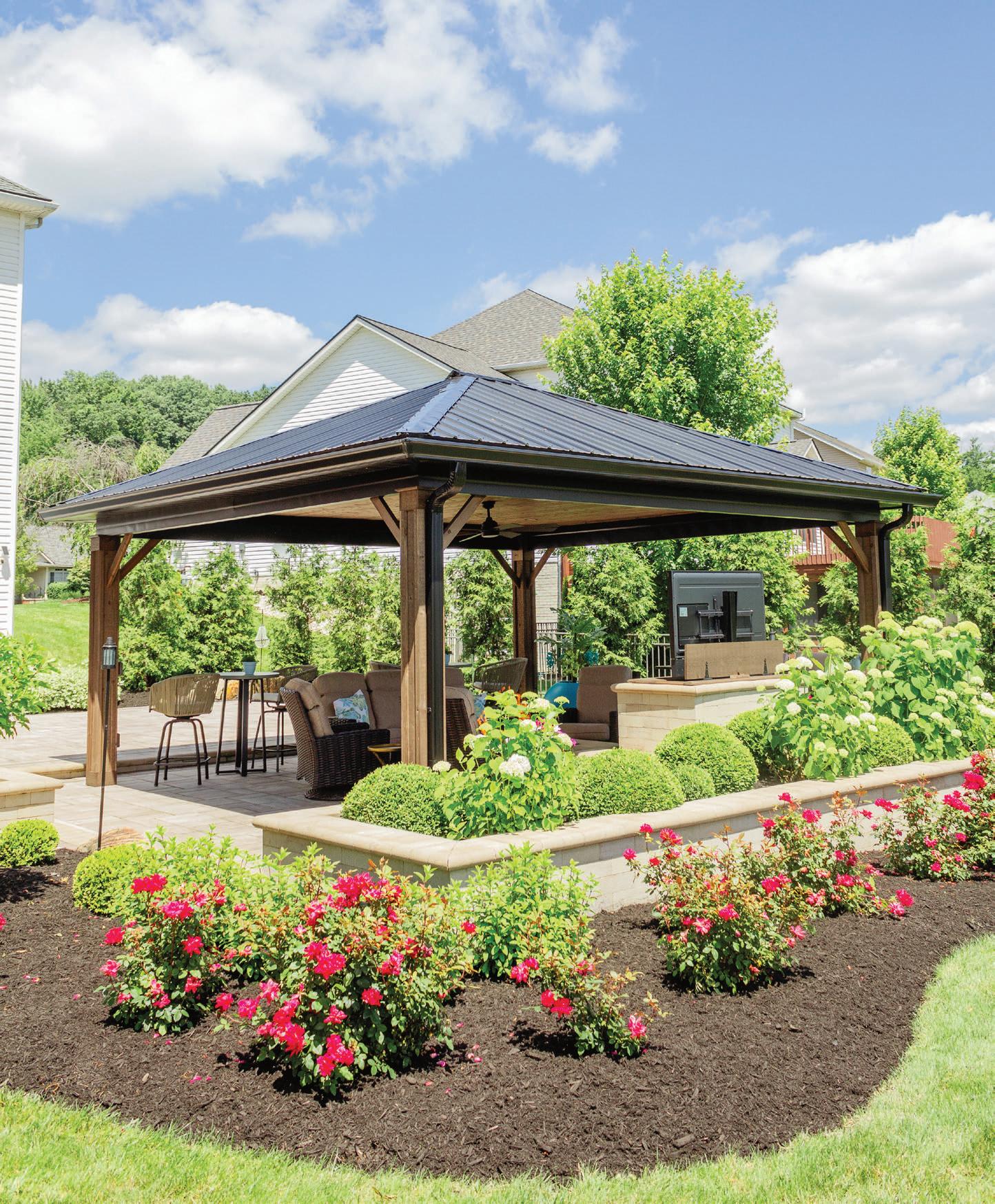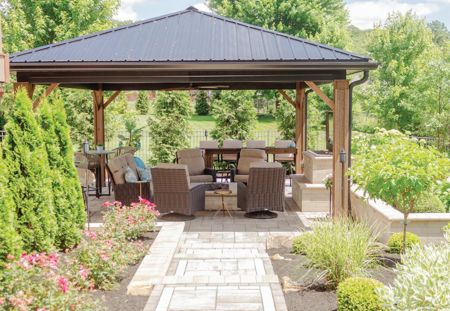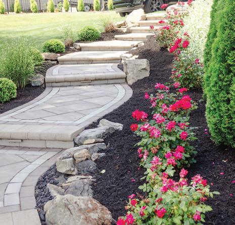 LANDSCAPING: The pathway and landscaping around the deck and patio area are accented with pink knockout roses, a hearty hybrid that grows well in Ohio, according to Baughman. Arborvitae and boxwood shrubs give the flowers a contrasting background. “They provide color from May to Thanksgiving,” he says.