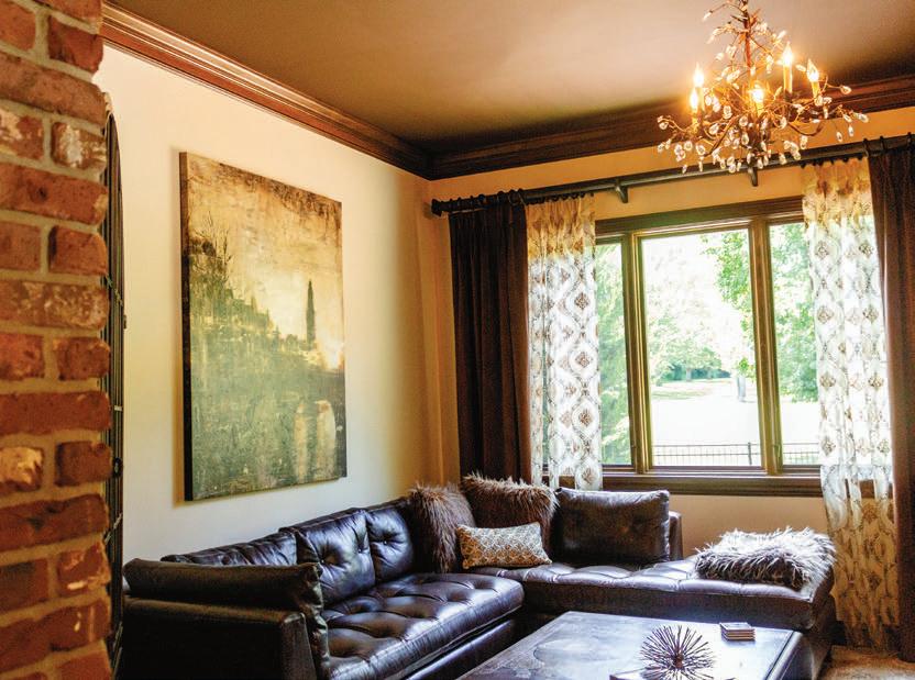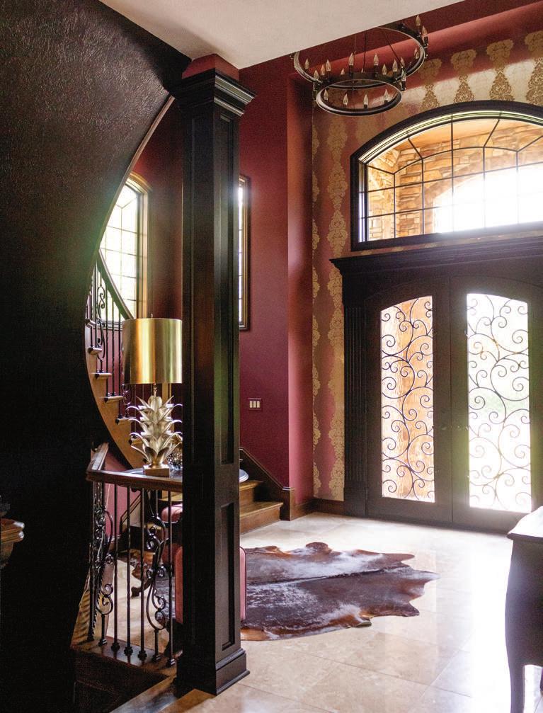 The living room features a barreled, gunmetalpainted two-story-tall ceiling, a crystal and metal orb chandelier and dark wallpaper flecked with gold. “I like dark, warm colors, especially against gold light fixtures,” Traci says. “It’s cozier.”