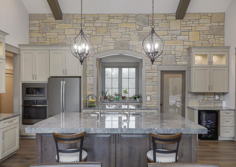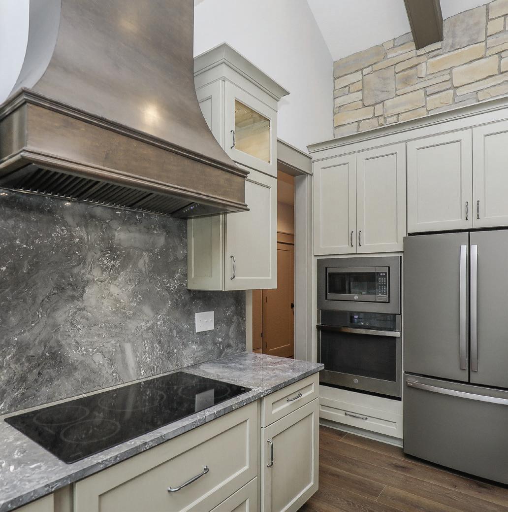 “They finished the copper to the patina that was exactly the color I liked,” Traci says of the hood. There is a limestone patterned backsplash under the cabinets,