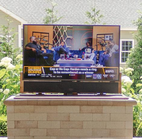 away from the back of the house and to the side of the deck. It features a gas fire pit, a unique TV display and another 400 square feet of paved walkway, wrapping around it and leading up to the driveway.