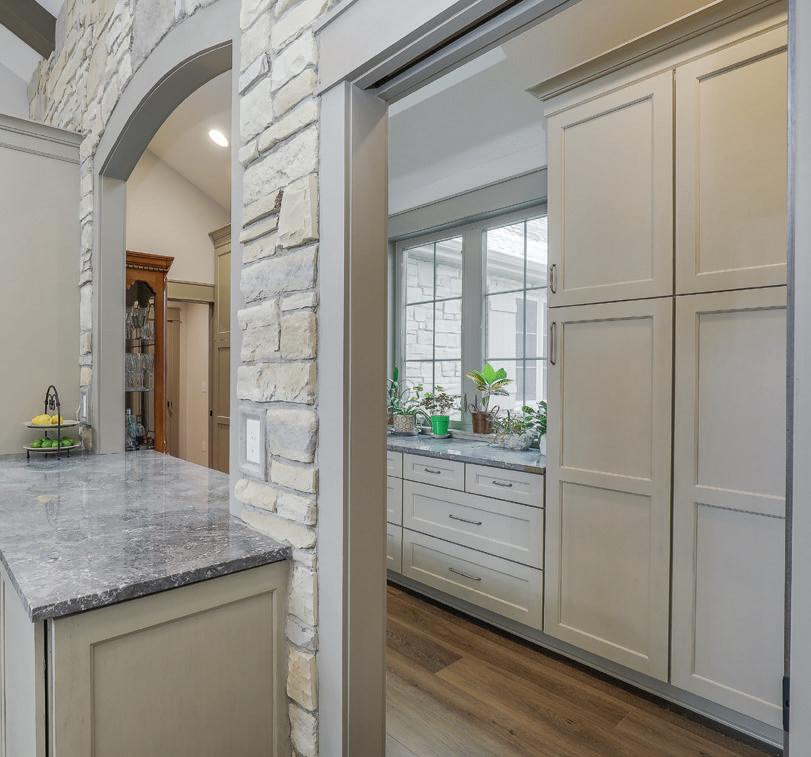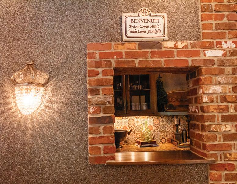 They built a version in their home — with a 6-by-15-foot room separated from the kitchen by a wrought iron door. Made by Glas Ornamental Metals in Barberton, it’s surrounded by red brick. Nearby, a sign, written in Italian, reads: Welcome. Enter as friends. Leave as Family. Inside the room, there’s a unique Tuscan-patterned limestone backsplash under the cabinets. “We searched for that Italian tile in that room for about a year,” Traci says.