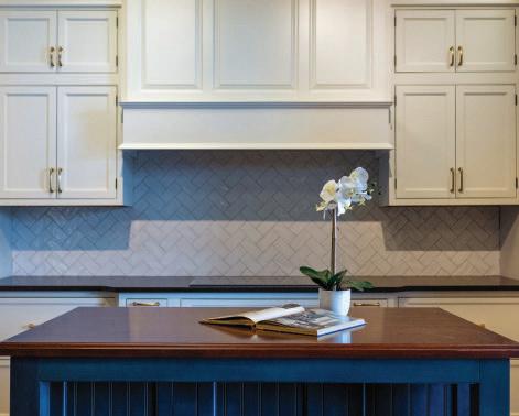 and behind the stove is a bold handmade Arabesque backsplash — painted in metallic brown, cocoa and old pyrite. Both backsplashes are from Morris Flooring & Design in Canton.