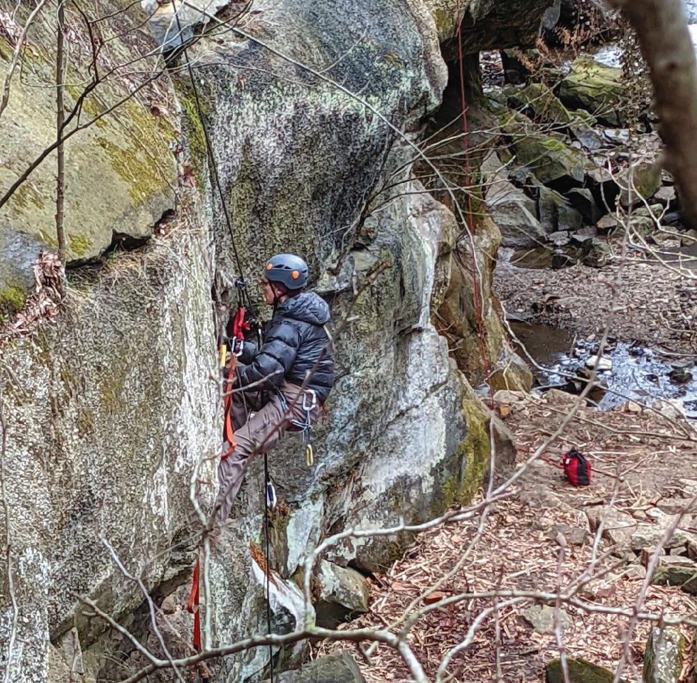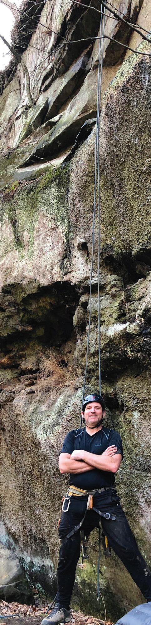 “We’re all about recreation. We have kayaking, inner tubing and fishing. There’s just so much to do here. And one day I was downtown, and I’m looking at these big walls, and I’m going, I wonder why no one climbs these things,” Walters recounts. His inquiry led to working with Norm Swann — the Northern Ohio stewardship director of the Ohio Climbers Coalition — to develop the area. In a rare instance, the mayor, wearing his business suit, was taken down to the spot. When Walters reached River Rock, everything was still except for nature.