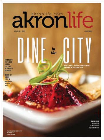 akronlife is published monthly by Baker Media Group, LLC, 1653 Merriman Road, Suite 116, Akron, OH 44313. Copyright 2024© by Baker Media Group, LLC, All rights reserved. Reproduction or use of editorial or pictorial content in any manner is prohibited without written permission. Unsolicited manuscripts will not be returned unless accompanied by an addressed envelope and sufficient postage. Baker Media Group, LLC and akronlife accept no responsibility for unsolicited material. Subscription rates: Continental U.S., One year —$19.95, Two years —$34.95. Call for Alaska, Hawaii or international rates. Single issues available by calling the circulation department or visiting akronlife.com/ store. $4.95 each plus $3.50 shipping & handling. Editorial, advertising and business offices: (330) 253-0056, fax (330) 253-5868.