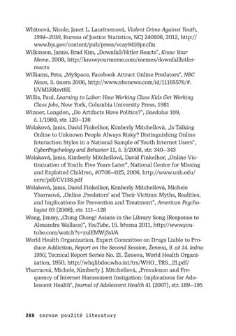 Whiteová, Nicole, Janet L. Lauritsenová, Violent Crime Against Youth, 1994—2010, Bureau of Justice Statistics, NCJ 240106, 2012, http:// www.bjs.gov/content/pub/press/vcay9410pr.cfm Wilkinson, Jamie, Brad Kim, „Downfall/Hitler Reacts“, Know Your Meme, 2008, http://knowyourmeme.com/memes/downfallhitler reacts Williams, Pete, „MySpace, Facebook Attract Online Predators“, NBC News, 3. února 2006, http://www.nbcnews.com/id/11165576/#. UVM1RRzvt8E Willis, Paul, Learning to Labor: How Working Class Kids Get Working Class Jobs, New York, Columbia University Press, 1981 Winner, Langdon, „Do Artifacts Have Politics?“, Daedalus 109, č. 1/1980, str. 120—136 Wolaková, Janis, David Finkelhor, Kimberly Mitchellová, „Is Talking Online to Unknown People Always Risky? Distinguishing Online Interaction Styles in a National Sample of Youth Internet Users“, CyberPsychology and Behavior 11, č. 3/2008, str. 340—343 Wolaková, Janis, Kimberly Mitchellová, David Finkelhor, „Online Victimization of Youth: Five Years Later“, National Center for Missing and Exploited Children, #0706—025, 2006, http://www.unh.edu/ ccrc/pdf/CV138.pdf Wolaková, Janis, David Finkelhor, Kimberly Mitchellová, Michele Ybarraová, „Online ‚Predators‘ and Their Victims: Myths, Realities, and Implications for Prevention and Treatment“, American Psycho logist 63 (2008), str. 111—128 Wong, Jimmy, „Ching Chong! Asians in the Library Song (Response to Alexandra Wallace)“, YouTube, 15. března 2011, http://www.youtube.com/watch?v=zulEMWj3sVA World Health Organization, Expert Committee on Drugs Liable to Produce Addiction, Report on the Second Session, Ženeva, 9. až 14. ledna 1950, Tecnical Report Series No. 21. Ženeva, World Health Organization, 1950, http://whqlibdoc.who.int/trs/WHO_TRS_21.pdf/ Ybarraová, Michele, Kimberly J. Mitchellová, „Prevalence and Frequency of Internet Harassment Instigation: Implications for Adolescent Health“, Journal of Adolescent Health 41 (2007), str. 189—195