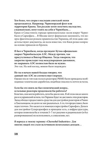 Тем более, что споры о наследии советской эпохи продолжаются. Например, Черноморский флот или территория Крыма. Там русские хотят получить наследство, следовательно, могут взять на себя и Чернобыль… Крым и Севастополь гораздо привлекательнее лесов вокруг Чернобыля и Саркофага… В Москве могут формально напомнить, что вопрос фактически решало правительство Украины, об этом даже свидетельствуют документы, но всем известно, что Киев решал вопрос на основе приказов из Кремля. Я был в Чернобыле, когда президент Кучма официально закрыл Чернобыльскую АЭС. Между прочим, там присутствовал и Виктор Ющенко. Тогда говорили, что закрытие происходит под международным давлением, но закрывать АЭС полностью было не нужно. Это так. На мой взгляд, можно было подождать Но ты в начале нашей беседы говорил, что данный тип АЭС не соответствует нормам. Однако после того как на всех реакторах РБМК были проведены необходимые технические доработки, подобная опасность почти исчезла. Если бы это опять не был политический вопрос, остальные реакторы продолжали бы работать? Конечно, они могли работать, хотя бы два из них. Я об этом писал много раз и в украинской печати, что Украине будет не доставать этих реакторов. Запад обещал предоставить средства для достройки реакторов в Ривно и Хмельницком, но долго не мог раскачаться. А то, что предоставил, было недостаточно. Это касается и помощи в перестройке Саркофага. Деньги для постройки Суперсаркофага в принципе есть, а инфраструктуры, которая позволила бы в течении 5–7 лет разумно и рационально (и без разворовывания) их использовать, к сожалению, нет. Я вернусь к твоему термину «Chernobyl Industries». Для многих людей это стало источником нелегальных доходов…