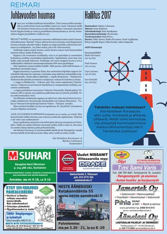 uosi 2017 on kaiken kaikkiaan historiallinen. Tänä vuonna meillä suomalaisilla on erittäin hieno teema meneillään: Suomi 100 vuotta. Vastaavasti meillä Ala-Keiteleen Pursiseurassa on myös aihetta juhlaan. Seuramme järjestämä Keitele-Regatta täyttää 40 vuotta ja purjehditaan tulevana kesänä 40. kerran. Ensimmäinen Regatta purjehdittiin virallisesti 1977. REGATTAMME on saavuttanut suosionsa osallistujien kesken kautta Suomen, tuttavallisemmin ”Keitsinä”. Voinen valottaa hivenen enemmän, mistä Regattamme koostuu ja kuinka eskaaderi kulkee: Regatta on etappi purjehdus, joka koostuu kolmesta eri osakilpailusta. Jos yhden missaa, peli ei ole vielä menetetty. Osallistujia saapuu ympäri Suomea, mutta olemme saaneet myös kansainvälistä haastetta Saksan maalta Zeuthenista. Regatta ei ole varsinainen arvokilpailu, vaan se on järjestäjien ja osanottajien keskuudessa mielletty enemmänkin tapahtumaksi. Tapahtumaan voivat ottaa osaa kaikki, jotka kynnelle kykenevät. Veneluokat ovat varsin simppeli: kevyet ja isot ja osallistujatkin vaihtelevat sunnuntaipurjehtijasta MM-tason purjehtijaan. Näin tapahtuma tarjoaa kaikkea kaikille. Mikä parasta, kyllä siellä kisataan, ei kuitenkaan verenmaku suussa. Regatta käynnistyy jo perjantai-iltana, kun ensimmäiset kilpailijat saapuvat Äänekoskelle Mustaniemen satamaan. Lauantaina aamu aloitetaan aamupalalla ja kipparikokouksella. Tämän jälkeen lähdetään 1. etapille Mustaniemi – Matilanvirta. Matilanvirralla pidetään perinteinen ruokapaussi, ruokana hernekeittoa ja lettuja. 2. etappi on Matilanvirta – Viukarin saari. Iltaa vasten majoitumme Viukarinsaareen. Viukarissa on perinteisesti iltaohjelmaa ja vastapaistettuja muikkuja, saunomista unohtamatta. 3. etappi purjehditaan sunnuntaina Viukarista Viitasaarelle. Kilpailu päättyy Viitasaaren ABC:n rantaan, jossa pidämme palkintojen jaon ja syömme porukalla. Sitten onkin kotimatkan vuoro. Turvallisuutta unohtamatta regatassa on tukiveneet, jotka myös hoitavat kevytveneiden matkatavarat. Järvipelastajat Äänekoskelta ovat mukana Mustaniemi – Viukari ja Viitasaaren Järvipelastajat hoitavat Viukari – Viitasaari -osuuden. Myös moottoriveneilijät ovat yksi osa tapahtumaa. He ”purjehtivat” perässämme seuraten kilpailun etenemistä. JUHLAVUODEN KUNNIAKSI teemamme on 40 vuotta, 40 venettä. Näin haastammekin kaikki ottamaan osaa rentoon ja mukavaan tapahtumaan. Tärkeintä ei ole voitto vaan osallistuminen! Ennen tapahtumaa muistetaan eräs tärkeä päivä tulevana sunnuntaina eli Äitienpäivä. Vaikka me miehet leikimme olevamme jotakin, kyllä se näin on, että naiset sen miehen takana häärää ja pitää perheestä huolta. Ala-Keiteleen Pursiseura ry toivottaa kaikille äideille Hyvää Äitienpäivää. Samalla toivotan kaikille hyvää alkavaa kesää, ollaan sitten vesillä tai teiden varsilla.