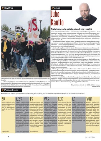Juho Kautto Ajatuksia valtuustokauden kynnyksellä Uuden valtuuston toimikausi alkoi 1.6. ja ensimmäinen valtuuston kokous pidetään 12.6. Tässä kokouksessa valtuusto valitsee puheenjohtajiston, hallituksen sekä lautakuntien jäsenet. Poliittisten ryhmien välillä paikoista onkin päästy sopuun. Tämä oli hieno osoitus äänekoskelaisesta perinteestä, jossa vaalitulosta kunnioitetaan. Poliittisten ryhmien ja kaikkien valtuutettujen välinen luottamus ja yhteistyö ovat jatkossakin kaiken keskiössä, kun teemme vastuullista politiikkaa Äänekoskella. Tuleva valtuustokausi on haasteita täynnä. Äänekoski on onneksi saanut taloutensa parempaan kuntoon ja tehnyt jopa ylijäämäisen tuloksen. Tästä annan tunnustuksen päättäneelle valtuustolle. Äänekosken tulee tehdä tarkkaa talouspolitiikkaa myös tulevaisuudessa. Kestävä talous on edellytys palveluiden kehittämiselle. Äänekoskella on paljon positiivista sykettä. Työttömyys on kääntynyt onneksi laskuun, vaikka onkin edelleen luvattoman korkealla. Erityisesti pitkäaikaistyöttömyyden hoidossa tarvitsemme edelleen tiukkoja toimia. Tarvitsemme myös vahvaa elinkeinopolitiikkaa, jotta saamme Äänekoskesta houkuttelevan paikan yritystoiminnan harjoittamiselle. Yrityksien saamiseksi, ei kaupunki voi mahdottomia ikävä kyllä tehdä. Meidän on kuitenkin tehtävä voitavamme, sillä tarvitsemme uusia ja pysyviä työpaikkoja Äänekoskelle. Ainoastaan työllisyyden parantamisen kautta saamme tulopohjaa hoitaa kunnan tehtävät laadukkaasti. Eteläisessä Suomessa pitkään asuneena, voin vilpittömästi sanoa, että Äänekoskella on monet asiat todella hyvin. Meillä on loistavasti harrastusmahdollisuuksia ja niiden hinnat ovat kohtuulliset. Peruspalvelumme ovat myös hyvällä tasolla, vaikka niissä onkin aina kehittämistä. Koulujen ja varhaiskasvatuksen ryhmäkoot on saatu pidettyä maltillisina. Toivomisen varaa on aina ja jokaisella sektorilla, mutta kokonaisuutta katsellen, emme ole Äänekoskella erityisen huonosti asioitamme hoitaneet. Olen itse palannut pitkästä aikaa Äänekosken poliittiseen elämään. Tuleva tehtävä asettaa itselleni suuria haasteita, sillä minulla on paljon opeteltavaa uudelleen Äänekosken asioista. Kierränkin siis mielelläni tutustumassa Äänekosken toimintoihin ja eri hallintokuntien palveluihin. Käyn myös mielelläni tutustumassa eri alojen järjestöjen toimintaan ja kuuntelemassa mahdollisia toiveitakin. Teemme varmasti jokaisen valtuutetun kanssa parhaamme Äänekosken eteen. Äänekoski Äänekosken lukion henki on siirrettiin perjantaina kuuluvasti ja näyttävästi Hiskimäeltä Puk- ja sen kaikki taajamat sijaitsevat upeissa maisemissa järvien ympäröiminä. Pidetään yllä elinkimäelle. mahdollisuudet joka puolella kaupunkia. Aktiiviset kylät ovat varmasti vahvuutemme tulevaiLukiolaiset opettajineen marssivat Hiskinmäeltä uuden lukion tontille. Rehtori Jaana Tani suudessa. Ennen kaikkea arvostetaan ja ollaan ylpeitä kotiseudustamme. kulki etunenässä ja kantoi mukanaan ruskeata matkalaukkua, jonka sisällä oli arvokas ja tärkeä Hiskin henki. Hiskin henki luovutettiin rakennusliike Porrassalmen työmaapäällikkö Ari Yhteistyöterveisin ja hyvää kesää toivottaen Juho Kautto Jylängille kolminkertaisen eläköönhuudon tehostamana.