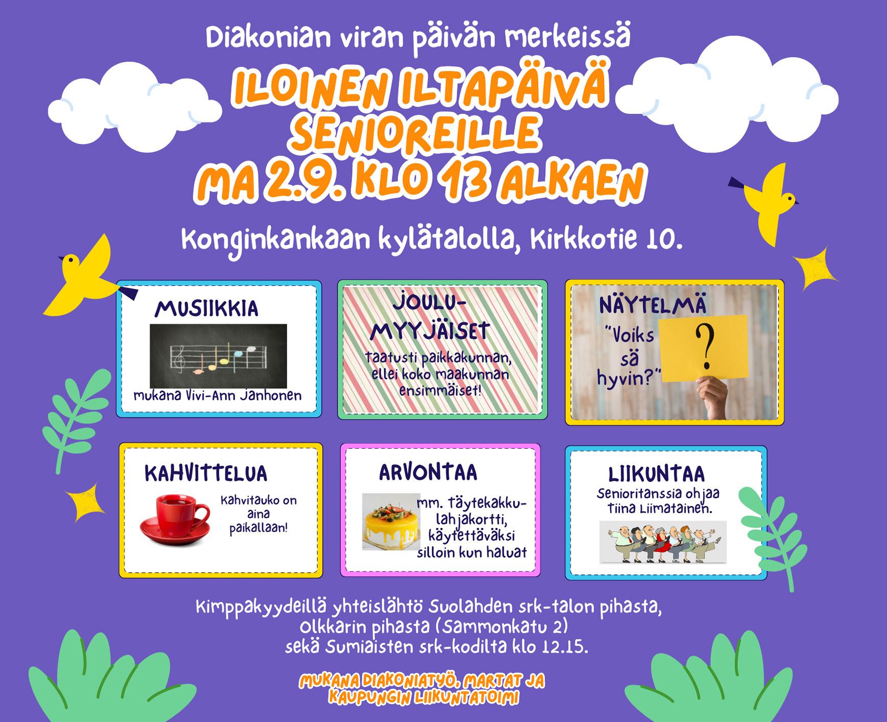Su 8.9. klo 13 (huom. aika!) Musiikkipainotteinen virsikirkko srk-salissa, johon kutsutaan erityisesti 85-, 90- ja yli 90-vuotiaat. Vuojus, musiikissa Timea ja Lilla Albert, Janhonen, Lahti. Juhlakahvit päätteeksi. Su 8.9. klo 18 ILTAn soolokonsertti kirkossa. Liput aikuiset 20 € ja alle 18v. 10 €. Liput ovelta tuntia ennen ja ennakkoon 19.8.-1.9. seurakuntatoimistosta (Vellamontie 1a, avoinna ma-to klo 9-12, maksu käteisellä).