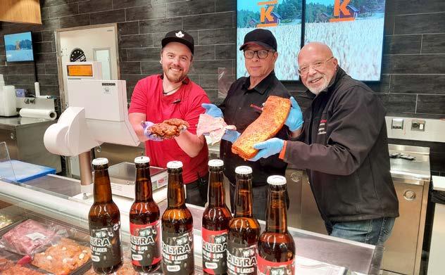 Äänekosken Cittarin myymäläpäällikkö Niko Pasanen, lihamestari Raino Salminen ja kauppias Mika Lankinen esittelevät palvelutiskin grillivalmiiksi työstettyjä lihaherkkuja.
