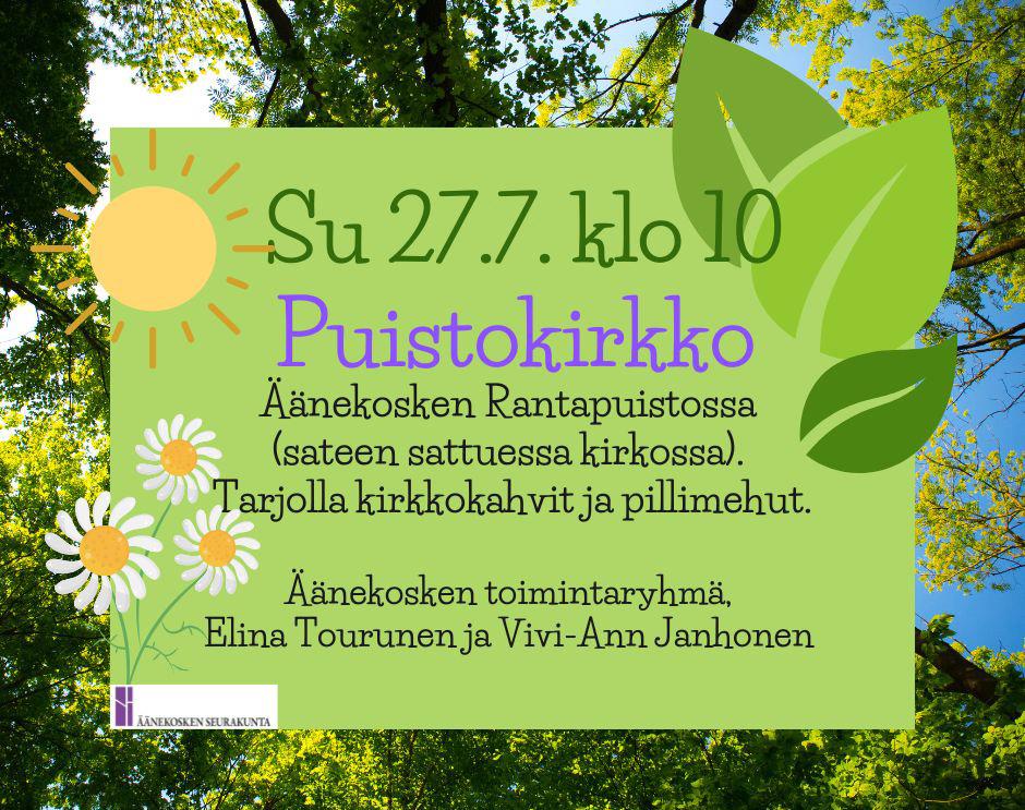 Su 27.7. klo 10 Ei messua kirkossa. Rantapuistossa kaupungintalon alapuolella Puistokirkko. Toimintaryhmä, Tourunen, Janhonen. Tarjolla kirkkokahvit ja pillimehut. Säävaraus: sateen sattuessa kokoonnumme kirkossa.
