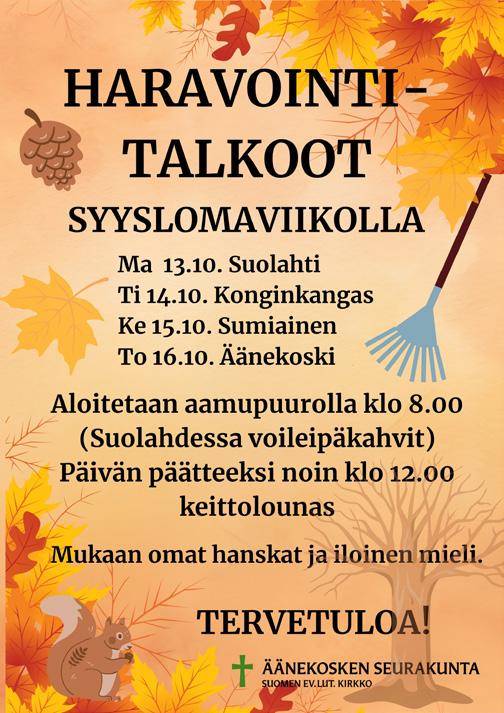 To 16.10. klo 8 Haravointitalkoot hautausmaalla. Aloitetaan aamupuurolla. Päivän päätteeksi n. klo 12 keittolounas. Ota mukaan omat hanskat ja iloinen mieli.