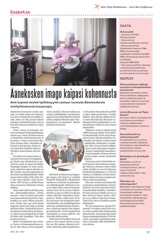 Äänekosken imago kaipasi kohennusta Arto Lepistö taisteli työttömyyttä vastaan luomalla Äänekoskesta miellyttävämmän kaupungin. Äänekosken kymmenen vuoden ajanjakso on erittäin tärkeä aika elämässäni ja hyvä korkeakoulu monellakin tavalla. Siihen asti olin pysynyt yhdessä työpaikassa keskimäärin kaksi vuotta ja kierrellyt erilaisissa työtehtävissä ympäri Suomea. Astuin virkaan 39-vuotiaana, Suomen nuorimpana kaupunginjohtajana, vuonna 1994. Suomi oli laman kourissa ja Äänekosken työttömyysprosentti oli masentava, se hipoi 30 prosenttia ollen Keski-Suomen pahin. Tammikuu oli lumeton ja maa mustana, oli kuin olisin laskeutunut Mordorin laaksoon. Odotukset minua kohtaan olivat kovat. Sen lisäksi että uimme laman syvimmissä syövereissä, oli Konginkangas liitetty juuri Äänekoskeen ja operatiivinen puoli jäi minun harteilleni. Kaupungin ilmapiiri oli myös masentunut, mikä lisäsi eripuraa ihmisten välillä. Onneksi sain tukea kokeneilta, pitkän linjan kunnallispoliitikoilta. Muun muassa Pauli Lunttila, Erkki Aalto, Pertti Salo, Simo Salmelin, Anita SarasteKautto, Olli Vertainen ja Heikki Korjus olivat nostamassa Äänekoskea takaisin jaloilleen. Uudet tuulet alkoivat puhaltaa pian, kun elektroniikkateollisuus kehittyi Suomessa. Tämä oli tärkeää aikaa koko maan kansantalouden kannalta ja Äänekoskikin sai osansa Nokian menestyksestä. Vuodet 1995–1997 olivat hurjia; kaupunki rakensi uusia tiloja ja ihmisiä palkattiin töihin. Äänekoskella järjestettiin jatkuvasti elektroniikan alan kursseja. Lyhyessä ajassa kaupunkiin oli tullut yli tuhat uutta työpaikkaa. Tästä alkoi positiivinen kierre. Muutos oli tapahtunut myös minussa. Tajusin, että kaupunginjohtajana roolini on valaa uskoa ja nostaa kaupunkiä Ks