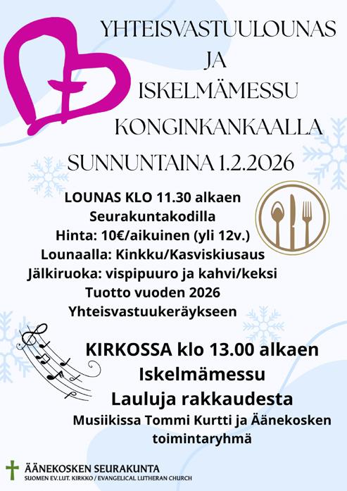 Lauantaina 28.2.2026 klo 17 Konginkankaan kylätalolle.