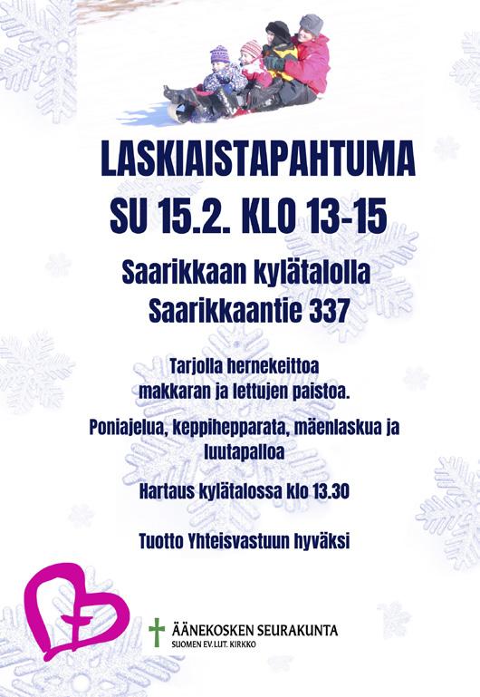 • su 15.2. Laskiaistapahtuma klo 13-15. Vastuutahot Äänekosken srk ja Saarikkaan kyläyhdistys