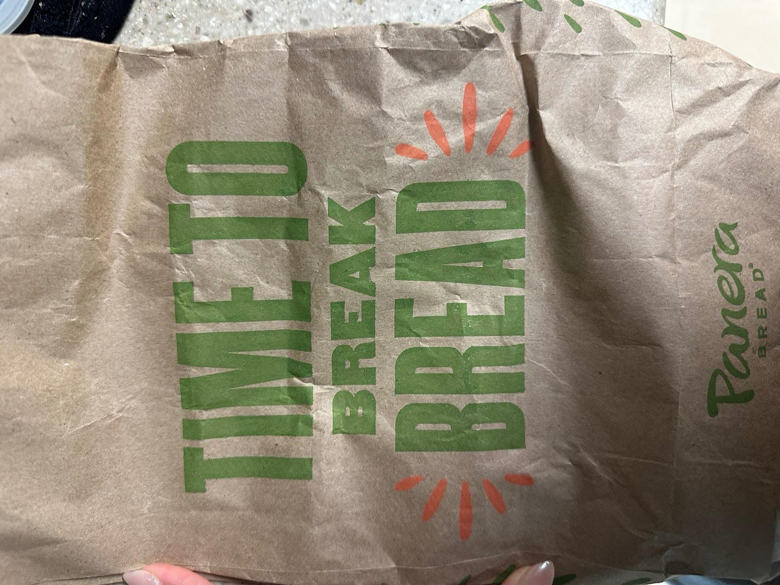 The design on this Panera bread bag is an example of good typography because it demonstrates clear hierarchy, balance, and effective use of space. The bold, sans-serif typeface used for the phrase “TIME TO BREAK BREAD” is strong, modern, and highly legible, making the message instantly readable even from a distance. The vertical alignment adds visual interest and breaks away from a standard horizontal layout, which helps catch the viewer’s attention. The words “BREAK” and “BREAD” are aligned in a way that visually emphasizes the brand’s central theme — connection and sharing over food.
