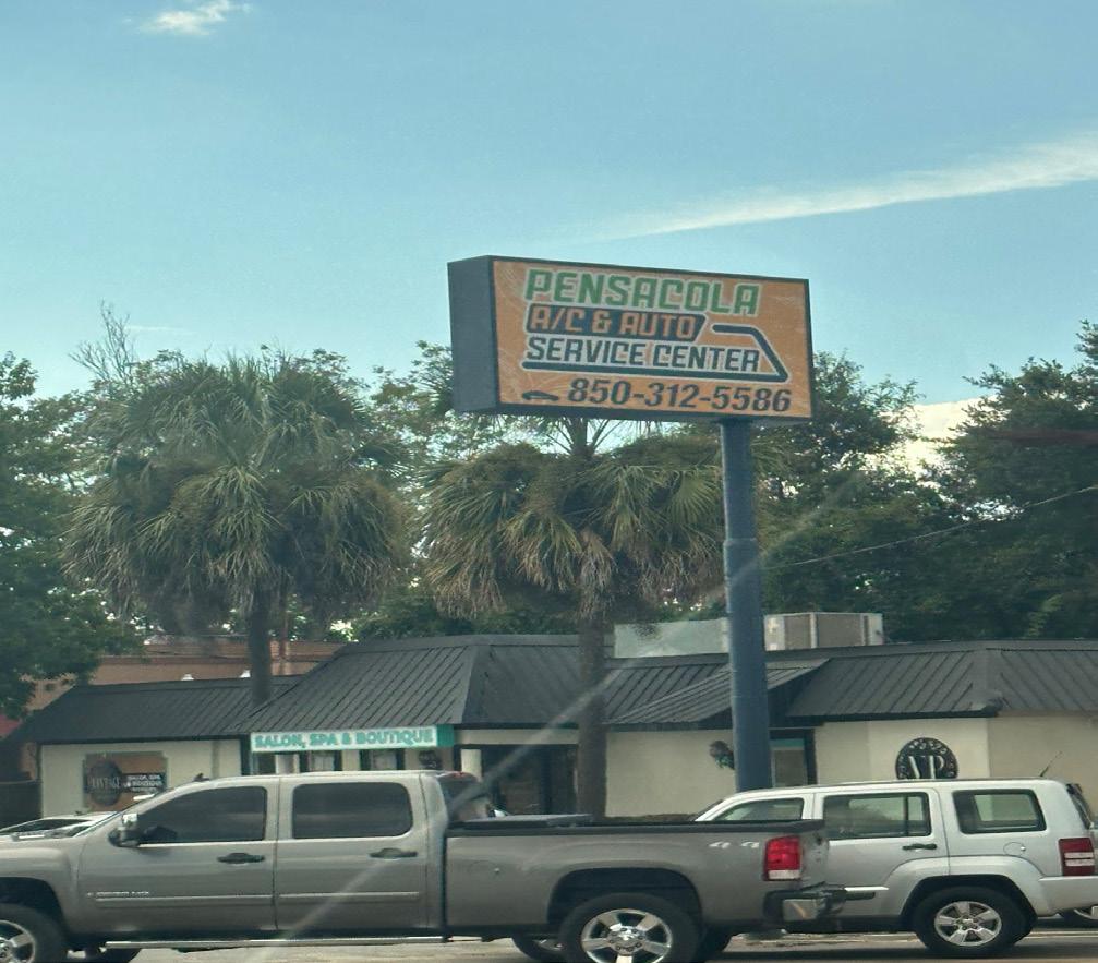 Color choices also hurt legibility. The orange background clashes with both the green and blue lettering, making the words harder to distinguish. The thin white outlines around some of the letters don’t give the design enough contrast against the bright background, so parts of the text fade, especially from a distance. Also, the multiple color schemes for each section, green, orange, and blue, create visual noise instead of guiding the reader logically through the information. Plus, the critical part about the A/C and auto service center is broken up and makes it harder to read, defeating the purpose of a quick roadside sign.