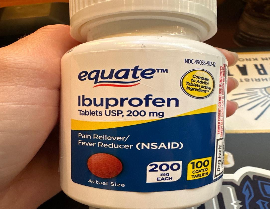Also, the combination of italicized, bold, and standard sans-serif typefaces with inconsistent spacing and alignment creates a disjointed visual flow. The circular and rectangular callouts with various font treatments—like “Compare to Advil” and “100 Coated Tablets”—add to the clutter and make the design feel crowded. While the label succeeds in including required information, it fails to present it in an orderly, visually appealing manner.