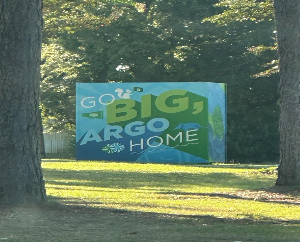 The use of contrasting weights and sizes of the text relates a natural hierarchy that guides the viewer’s eyes from “GO” to “BIG,” then “ARGO,” and finally “HOME.” Every word feels intentional in their placement, with the diagonally aligned “ARGO” adding movement and energy without sacrificing clarity. The color choices of the green and blue creates harmony with the natural surroundings while tying with school spirit. The mix of -what looks like- sans-serif type with playful design elements, like the squirrel and the flags, makes the composition approachable and lively.