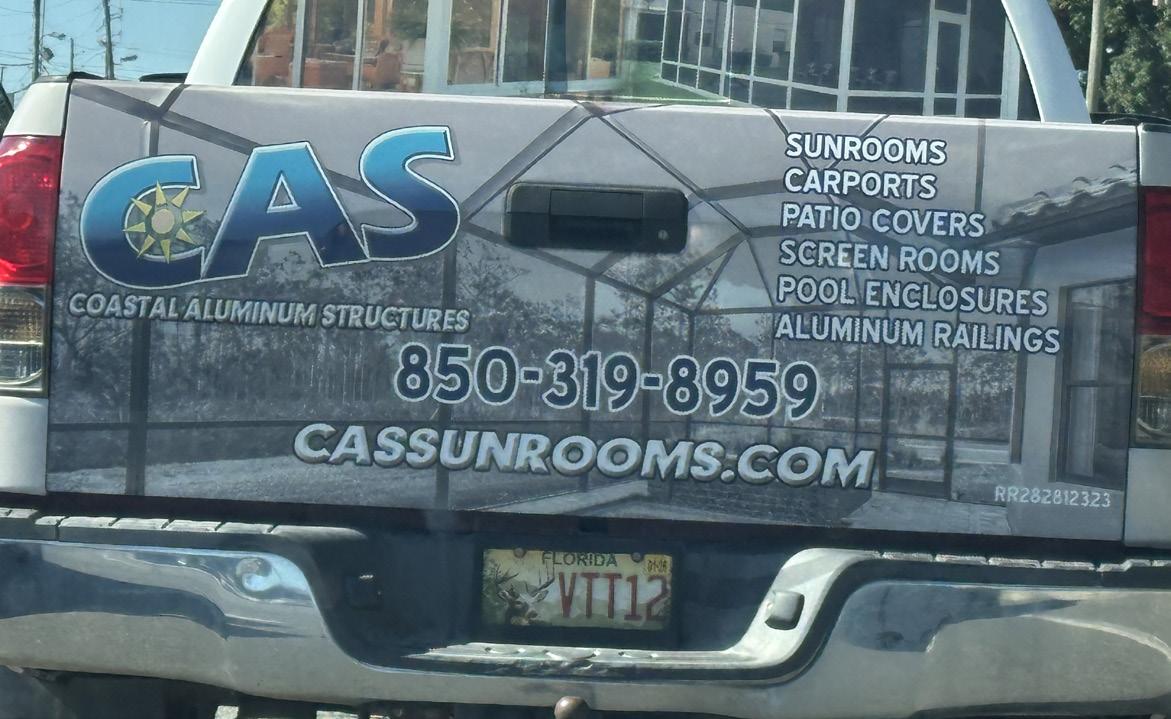 This photo I took was on my way to work. I was behind this Coastal Aluminum Structures company truck and didn’t think its back design was appealing. It seems off-balance and almost random. As if someone threw it together too quickly. The company name “CAS” is a little oversized in my opinion, and the supporting text of what the company is is far too small to see from a distance. The phone number is off-center with the company website. To make this better, in my opinion, they would need to have a clearer order of importance, service, making the business name, and contact information quickly identifiable.