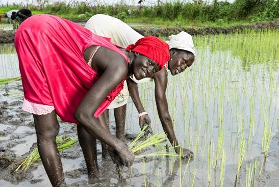 Titelfoto: Nyayiela Nyuon pflanzt Setzlinge aus dem Gewächshaus in ihr Reisfeld. Unser Pilotprojekt führte den Reisanbau in ihrer überschwemmten Heimatregion Paguir ein.