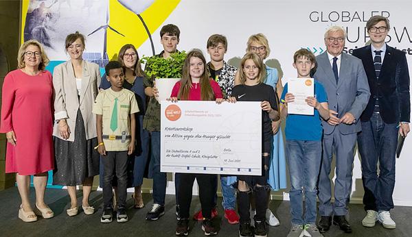 Beim Schulwettbewerb zur Entwicklungspolitik alle für EINE WELT für alle ehrten Bundespräsident FrankWalter Steinmeier und Bundesentwicklungsministerin Svenja Schulze das Engagement junger Menschen. Unsere Geschäftsführerin Dr. Helene Mutschler überreichte im Namen von Aktion gegen den Hunger den Sonderpreis der NGOs an zwei engagierte Schulklassen.