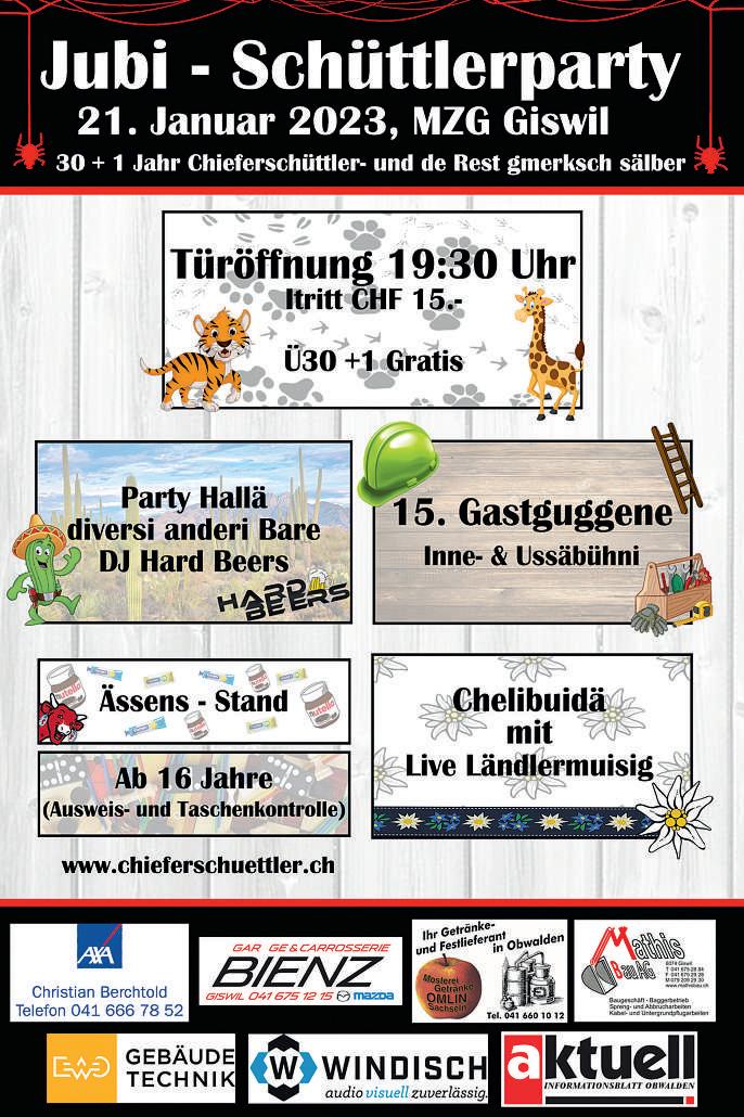 Schüttlerparty Giswil 30 + 1 Jahr Chieferschüttler und de Rest gmerksch sälber 19.30 Uhr Partyhalle und andere Bars, «Chelibuidä» Essensstand, 15 Gastguggen Mehrzweckgebäude Giswil Chieferschüttler Giswil