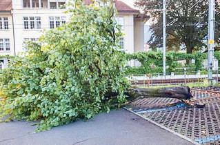 EinheftigerSturm mitStarkregenist am Montagabendzwischen19und 19.30 Uhr über dasSarneraatalhinweggefegt.Mit Blickauf Brienz istObwaldenvom Gröbsten verschontgeblieben,trotzdemgab es auch hier vereinzelt Schäden. Beiden Parkplätzen des«Lindenhof» in Sarnen beispielsweise wurdeein Baum komplett umgerissen (Bild). Vereinzelt traten Bächeüberdie Ufer und Strassenmussten wegenkleineren Erdrutschen oder Übersarungen gesperrt werden, so etwa dieKleinteiler- undPanoramastrasse in Giswil. Auch standeneinigeKeller unter Wasser. In Kleinteilfiel zudemwährend knappzweiStunden derStrom aus.