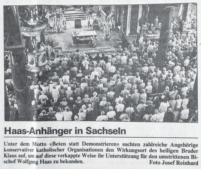 Ende 1997 kehrte Ruhe ein Dass BischofHaaskeingerngesehener Gast in denBistumskantonen (Graubünden, Schwyz,Uri,Nidwalden,Obwalden, Glarus und Zürich)war,hinderteihn bekanntlich nichtdaran,seinAmt fortzuführen.Die Folge davonwar einmarkanter Anstiegvon Kirchenaustritten. Auch in Obwalden traten diemeisten Gläubigen«eindeutigwegen BischofHaas» ausder Kirche aus, wieKarl Imfeld,damaliger Dekanund Pfarrervon Kerns, im März 1992 gegenüber derNachrichtenagentur SDAsagte.Das Schlitzohr Karl Imfeld –ebenfalls erklärterGegner desBischofs– liess es sich natürlichnicht nehmen,die schriftlichenKirchenaustritte direkt ansBistumChurweiterzusenden.