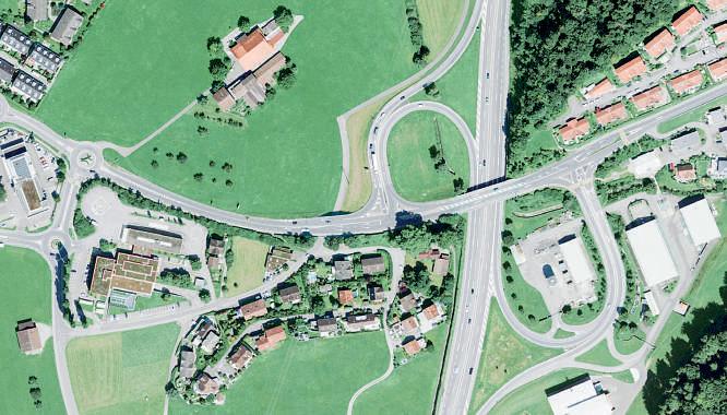 Wieder Halbanschlussbaulichrealisiert werden könnte, istnochoffen.Die Ausfahrt (roter Pfeilauf Karte) könnteüberdie dortige Werkstrasseerfolgen(Bild unten rechts). Fürdie Einfahrt Richtung Luzern gibt es zwei Optionen:ebenfalls vonder Werkstrasse ausvia Überführung (gelberPfeil)oder vonder lang gezogenenKurve derKernserstrasse aus(blauer Pfeil)