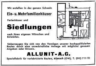 EinBeispielfür ihrneuartigesBausystem schäftsmännerander Basler messe 1948. In der«Neuen herZeitung»erschienenin eser Zeit verschiedene InseraderAllunitAG. Rudolf Rossmann hatte sein Verfahrenzur Herstellung vonBauelemenn1944 patentierenlassen. nGeschäftsmännern aus schlandwar in Alpnachallerngswenig Glückbeschert. Be-