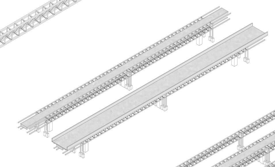 The series of trusses acts in tandem with an already existing bridge, pedestrian or automobile. They are constructed parallel to the bridge to offer support for a future development that integrates with the existing structure. This can be a wider pedestrian bridge, a medium sized highwaypark covering, or a large housing and retail development highway cap.