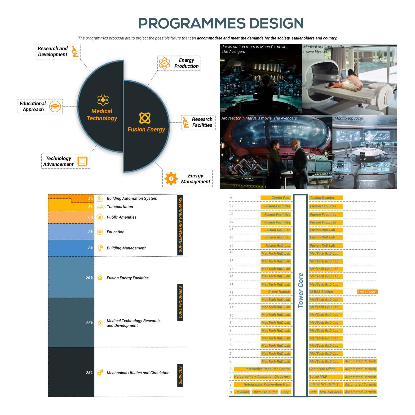 This tower will comprises 2 main core programs which are medical technology research and development and the sustainable energy harnessing, fusion reactor. It is ambitious to make the tower able to achieve zero-net energy and plus.
