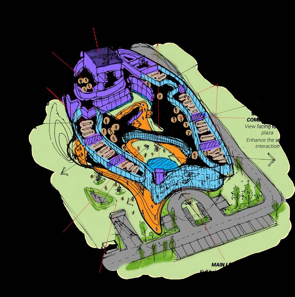 The approach of this development is to create an efficient planning which all the hostels are constantly near to centre facilities. We also introduce the Student Plaza area at the centre of the development to enhance the social interaction of the students and make the development lively.