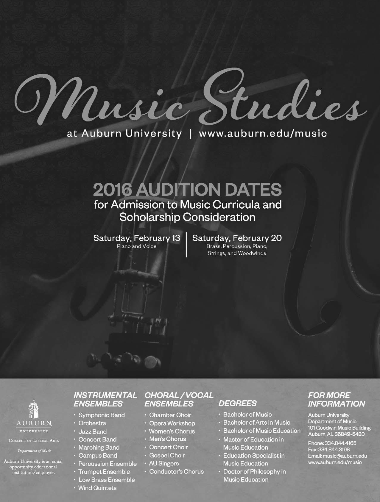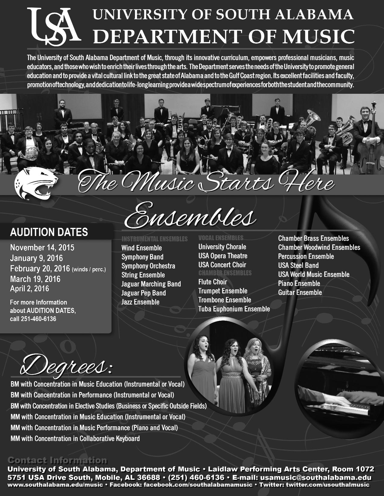 The Department of Music at UAH prepares musicians for careers as performers, educators, composers, church musicians, and music industry professionals. Noted for quality instruction by nationally and internationally renowned faculty, and an accredited institutional member of the National Association of Schools of Music, we offer eight music emphases, numerous ensembles, and over 150 performances each year.