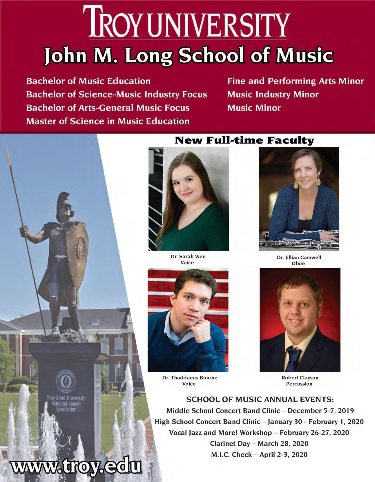 The Department of Music at Alabama State University will welcome two new instructors to campus this fall. Dr. Michael Westmoreland, will be joining the faculty to lead the University Wind Ensemble and Symphonic Band, and will also teach courses in the music education and woodwind areas. Ms. Jessica Williams, will also be joining the faculty to teach applied percussion and percussion methods, and will serve as director of the ASU Percussion Ensemble. The Department of Music is particularly pleased to announce a new alumni event happening this fall, the ASU Alumni Choir, in honor of the recently retired Dr. Joel Jones, to take place during the Labor Day Classic festivities on campus during the weekend of September 5-8. Interested alumni may contact the music office at (334) 2294341 for more information.