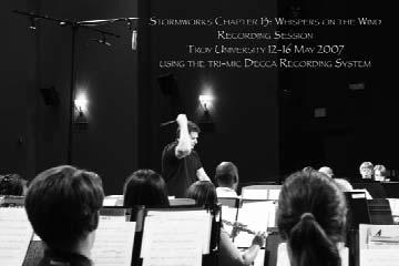 With the utilization of Function Chorales, PAD Bass, and new seating positions established as essential components of the Troy University Symphony Band, the collaboration to record with Melillo began. The first recording project so impacted the ensemble that the students requested making a STORMWORKS CD part of the curriculum at Troy. In the spring of 2007 Melillo returned to record STORMWORKS Chapter 13: Whispers on the Wind. Numerous adjustments and improvements were made as a result of the first recording session. Further enhanced changes in physical seating space (see Fig. 2), a carefully researched miking configuration with a Tri-Decca System typically utilized in the days of Stereophonic High Fidelity (see Fig. 3), enhancement of natural reverberation by the use of 2 additional rear-hall mikes, employment of direct box lines for each synthesizer, and the use of a new Roland synthesizer deriving one voice as a choir were some of the adaptations made. These factors, in conjunction with Melillo’s orchestration and the musical advancement of the Troy ensemble, converged to produce what Melillo envisions as “Music rendered by a Symphonic Band of the 3rd millennium.”