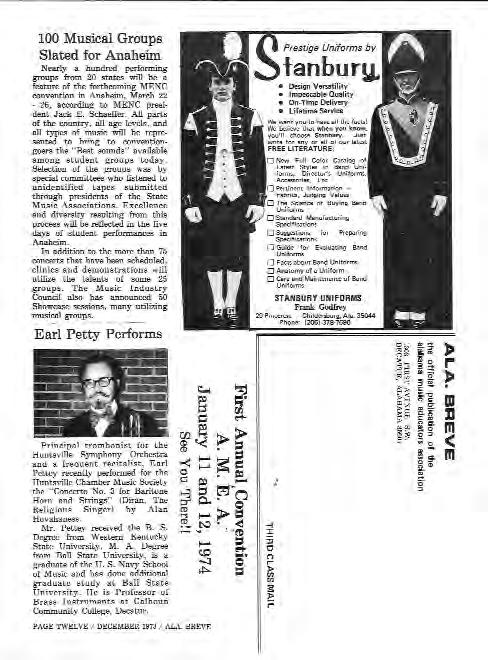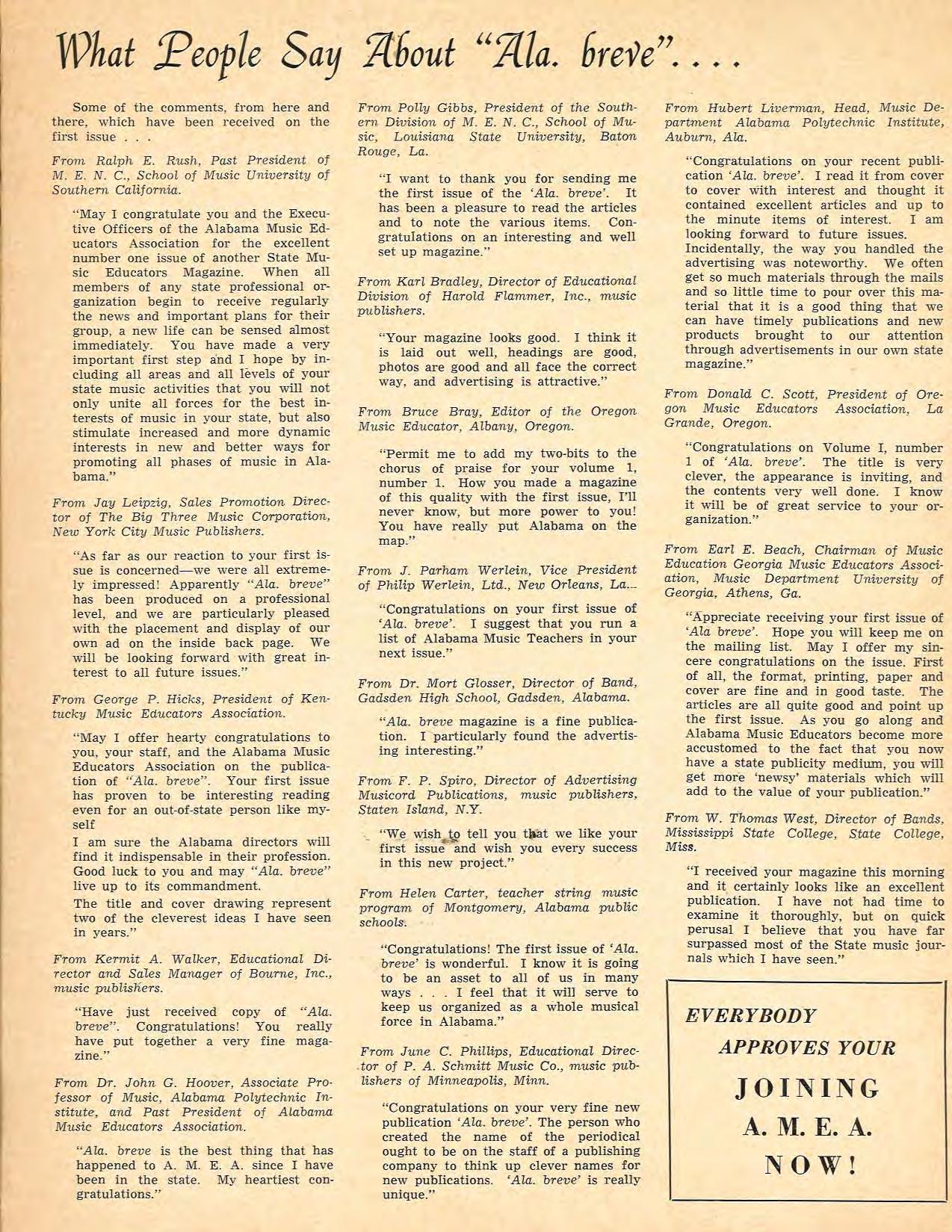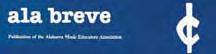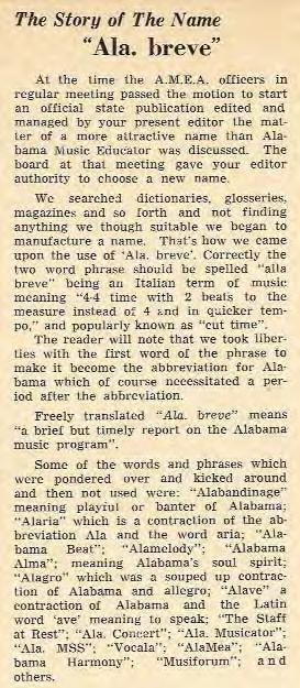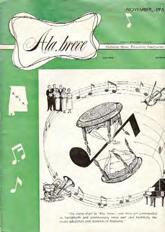 Association wrote, “May I offer a hearty congratulations to you, your staff, and the AMEA on the publication of Ala. breve. Your first issue has proven to be interesting reading even for an out-of-state person like myself. I am sure teachers will find it indispensable in their profession. Good luck to you and may Ala. breve live up to its commandment. The title and cover drawing represent two of the the cleverest ideas I have seen in years.”