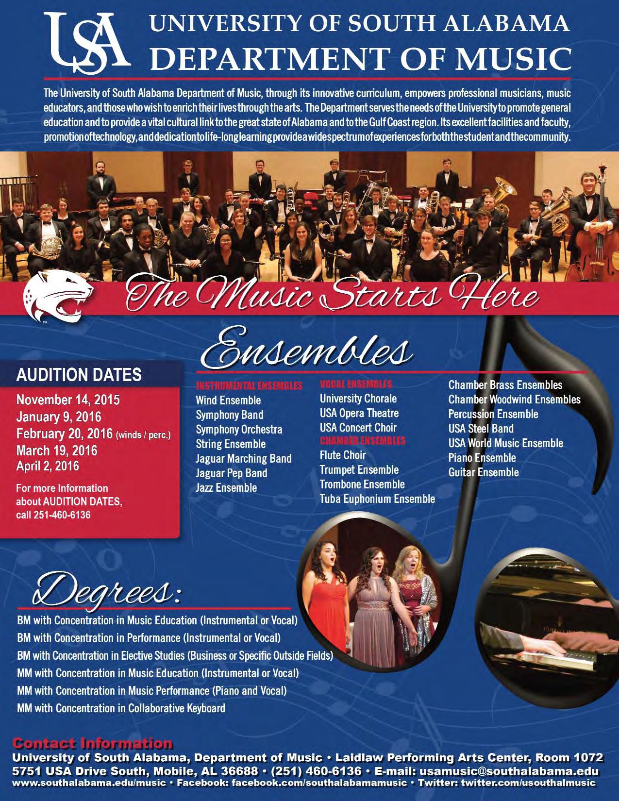 Ensembles Huxford Symphony Orchestra Alabama Wind Ensemble Alabama Symphonic Band Alabama Concert Band Alabama Jazz Ensemble Contemporary Ensemble University Singers University Chorus UA Opera Theatre The Million Dollar Band music.ua.edu The University