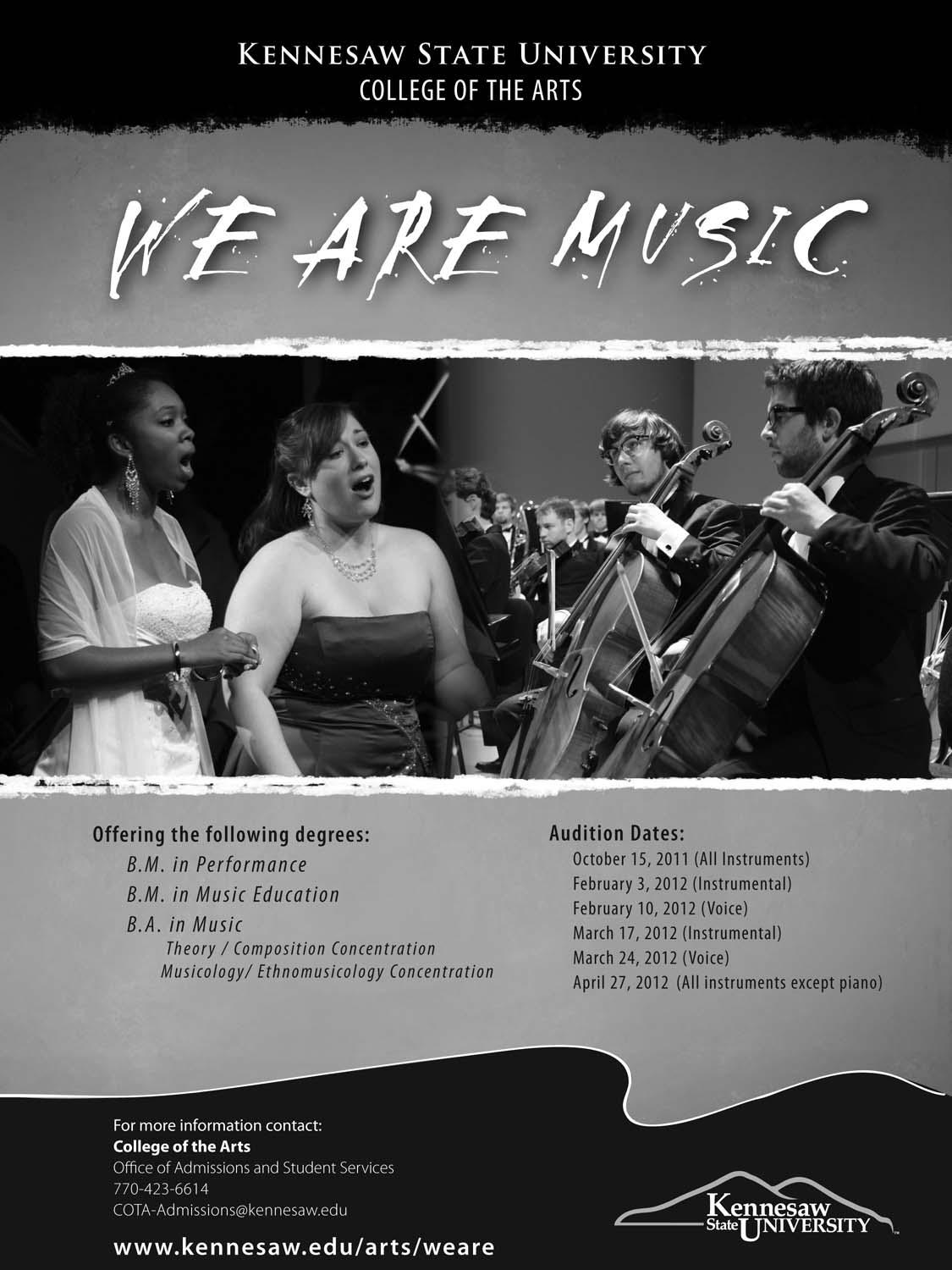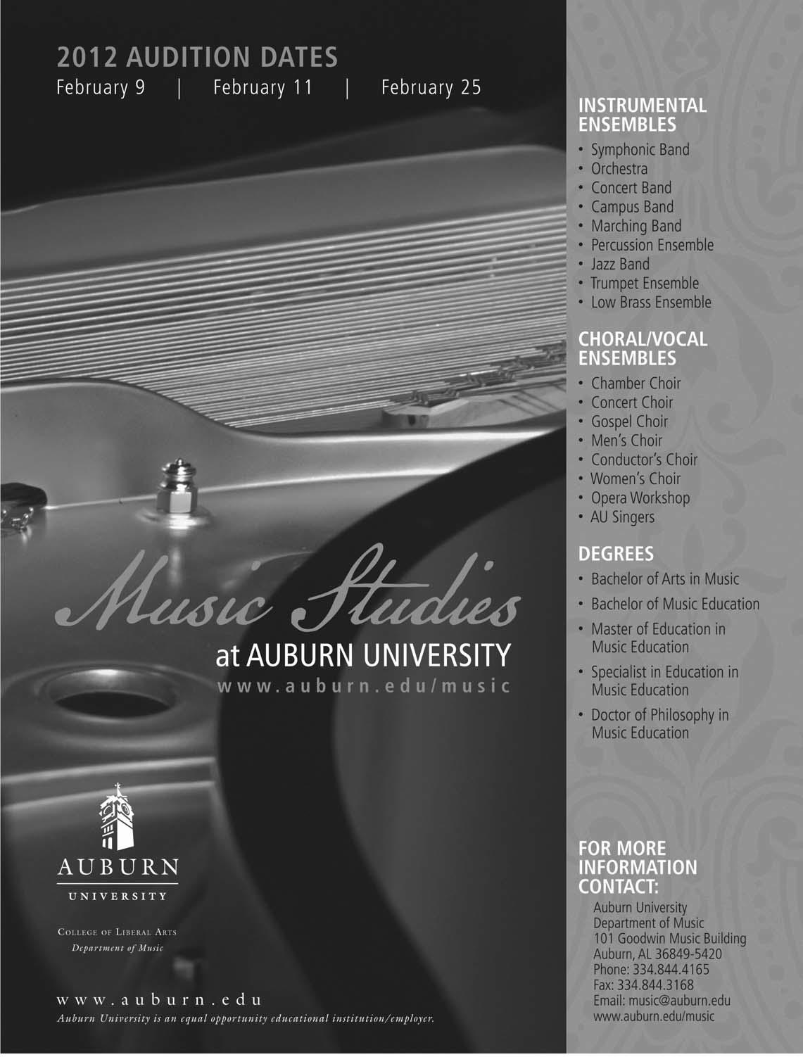 58 October/November 2011 256-824-6436 music@uah.edu www.uah.edu/music H UAHuntsville THE UNIVERSITY OF ALABAMA IN HUNTSVILLE Music Scholarships Available Concerts Streamed Live Online uah.edu/music/live UAHuntsville Chamber Choir Dr. Erin Colwitz, Conductor AMEA Conference 4:30pm ~ Friday, January 20 Montgomery Performing Arts Center dmit One A AitO dm ne