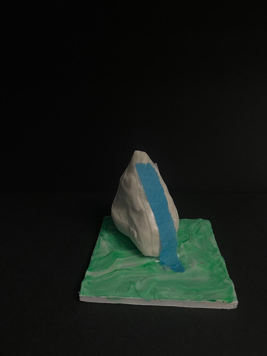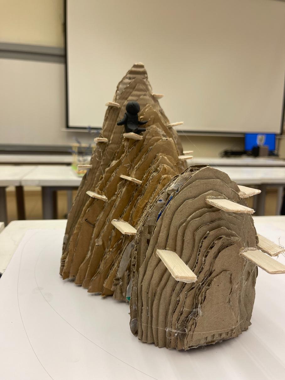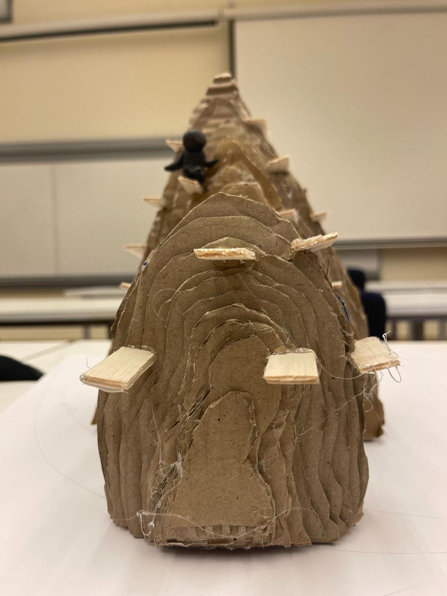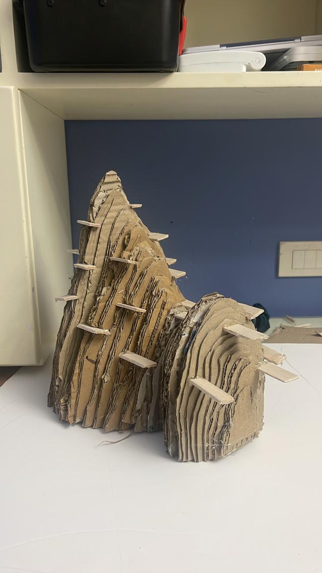 Feedback: I tried to show what i needed to show; a mountain along the green scape of the Cultural Park. The mountain had a slide on one side, like a waterfall, and the stairs on the oppoite sides. I used clay, wre and paper.