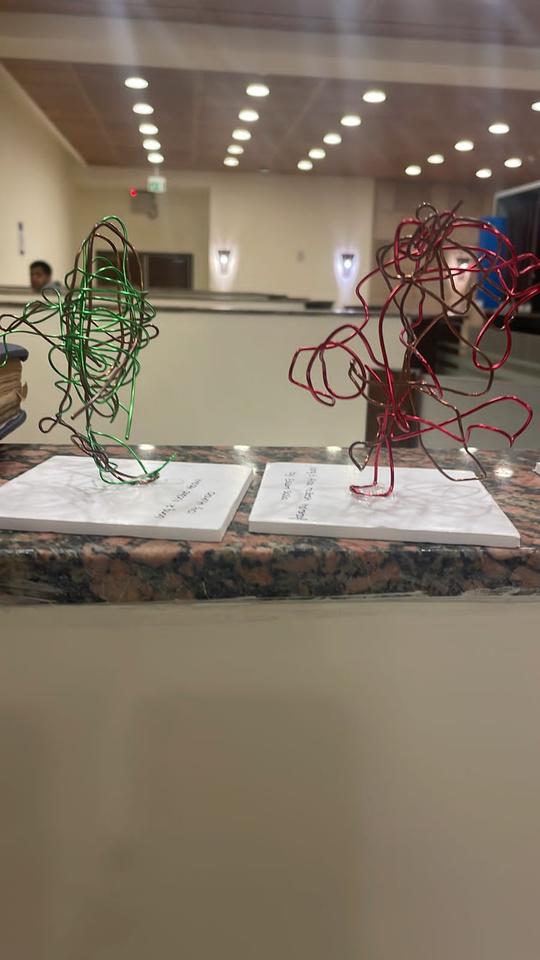 In this exercise, i used three Egyptian songs of different genres. i thouht it would be a god idea to embed my feelings wiht color but then i was told that it was supposed to be made with only one wire. I tried showing the softness, raggedness, and meaning behind each song in my statues.