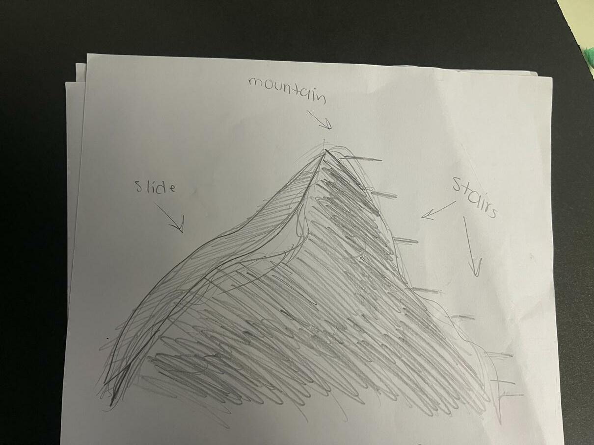 It was not a hard task My idea consisited of a mountain that would respresent a slide. It would be put in anempty green part in the park and would be 7-14 year old children.