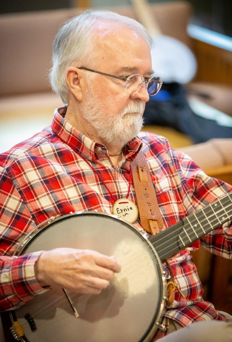 Above: Herb and Gary at the Alabama Folk School, 2020. | Herb in Fretted Instruments, 2007. Right: A young Herb Trotman playing banjo. | Herb teaching a guitar class at AFS.